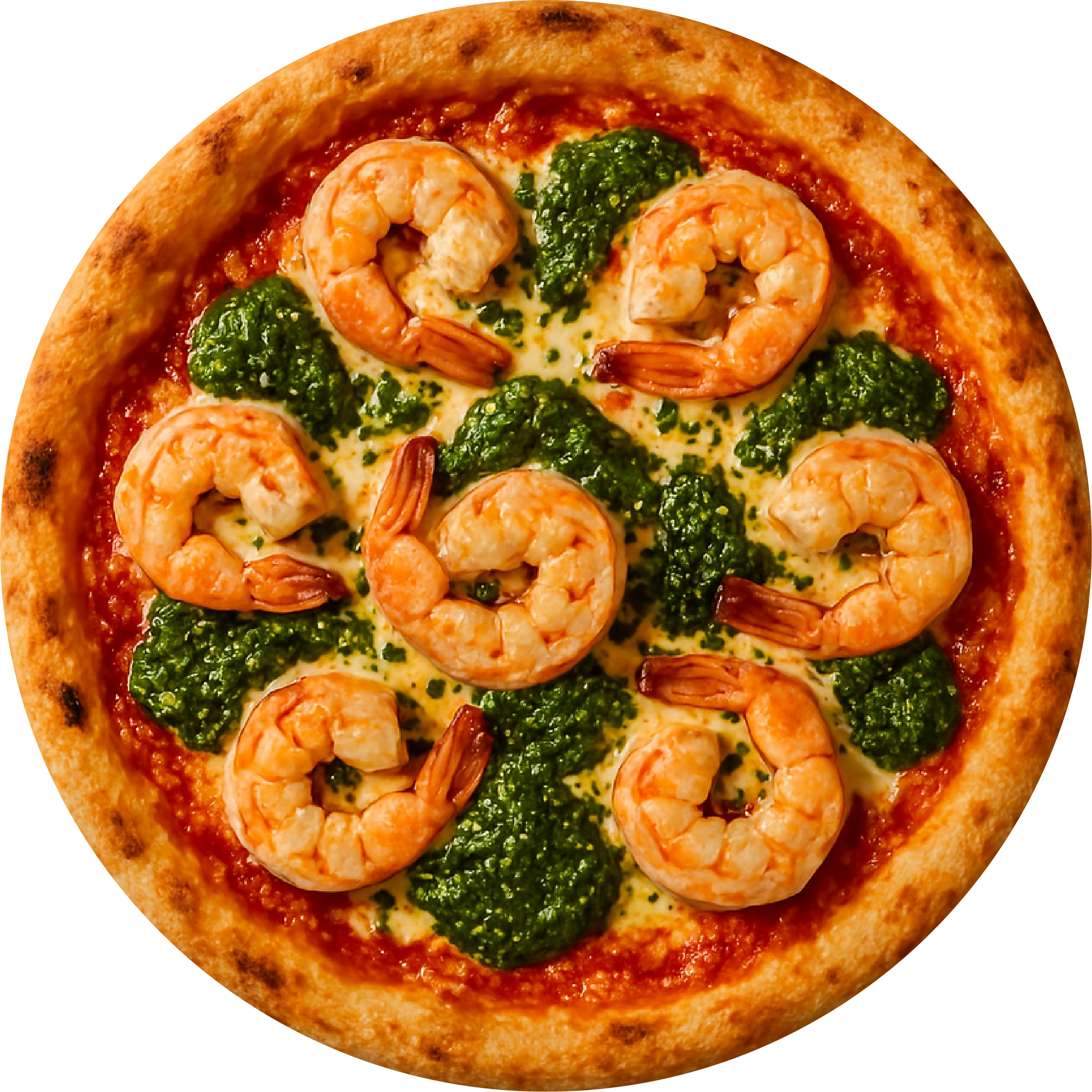 Tomato sauce, mozzarella cheese, prawn tails cherry tomatoes and basil pesto.