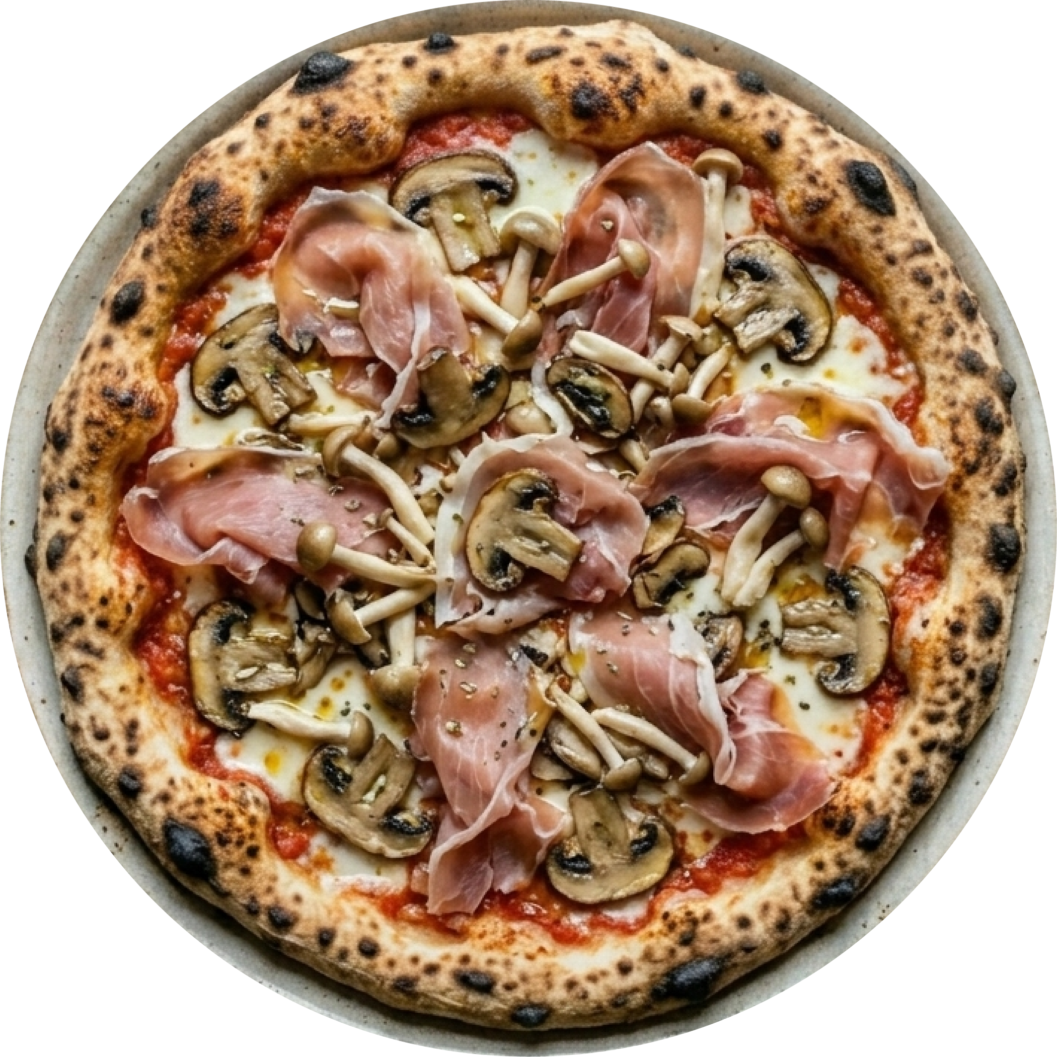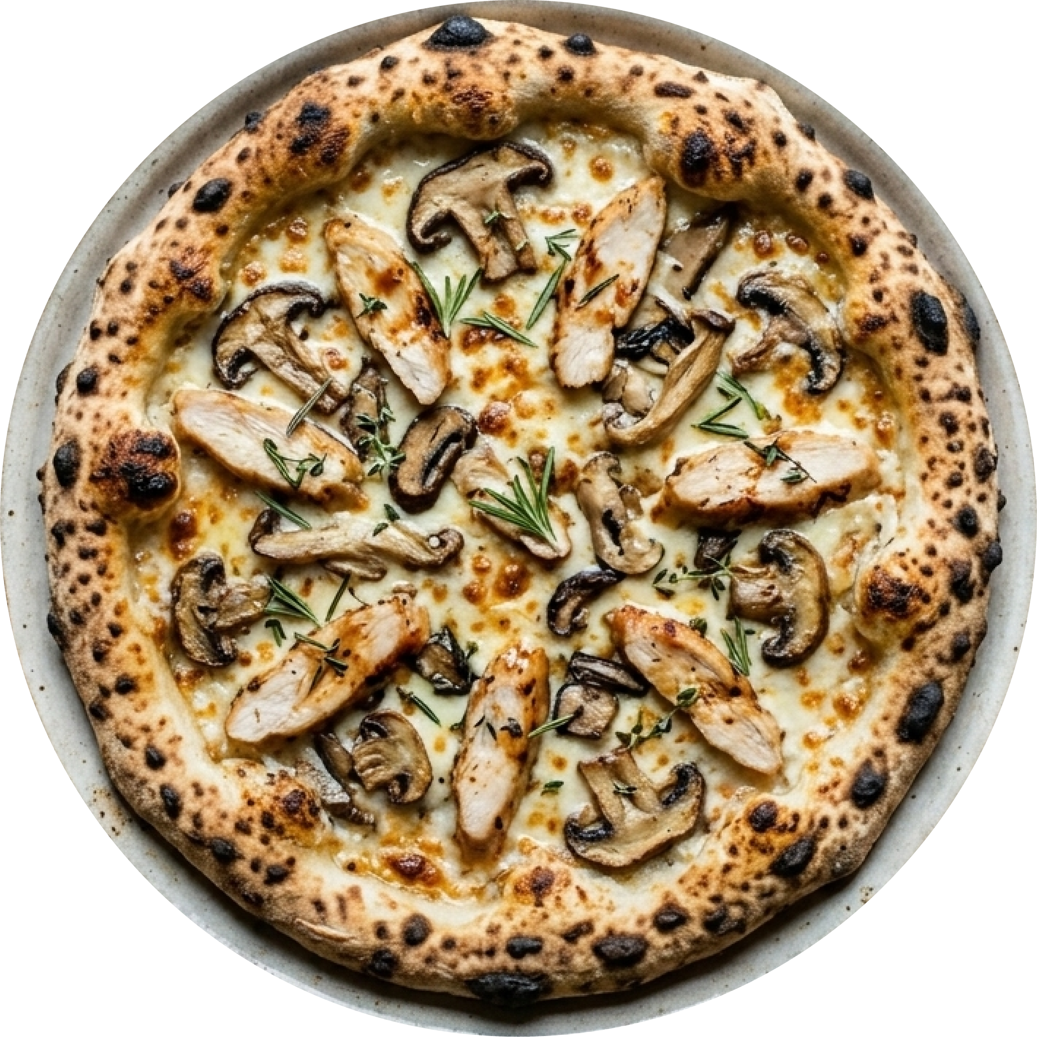 Tomato Sauce, Chicken breast, Caramelized Onion, Mushroom, Mozzarella, Basil, Parmigiano-Reggiano